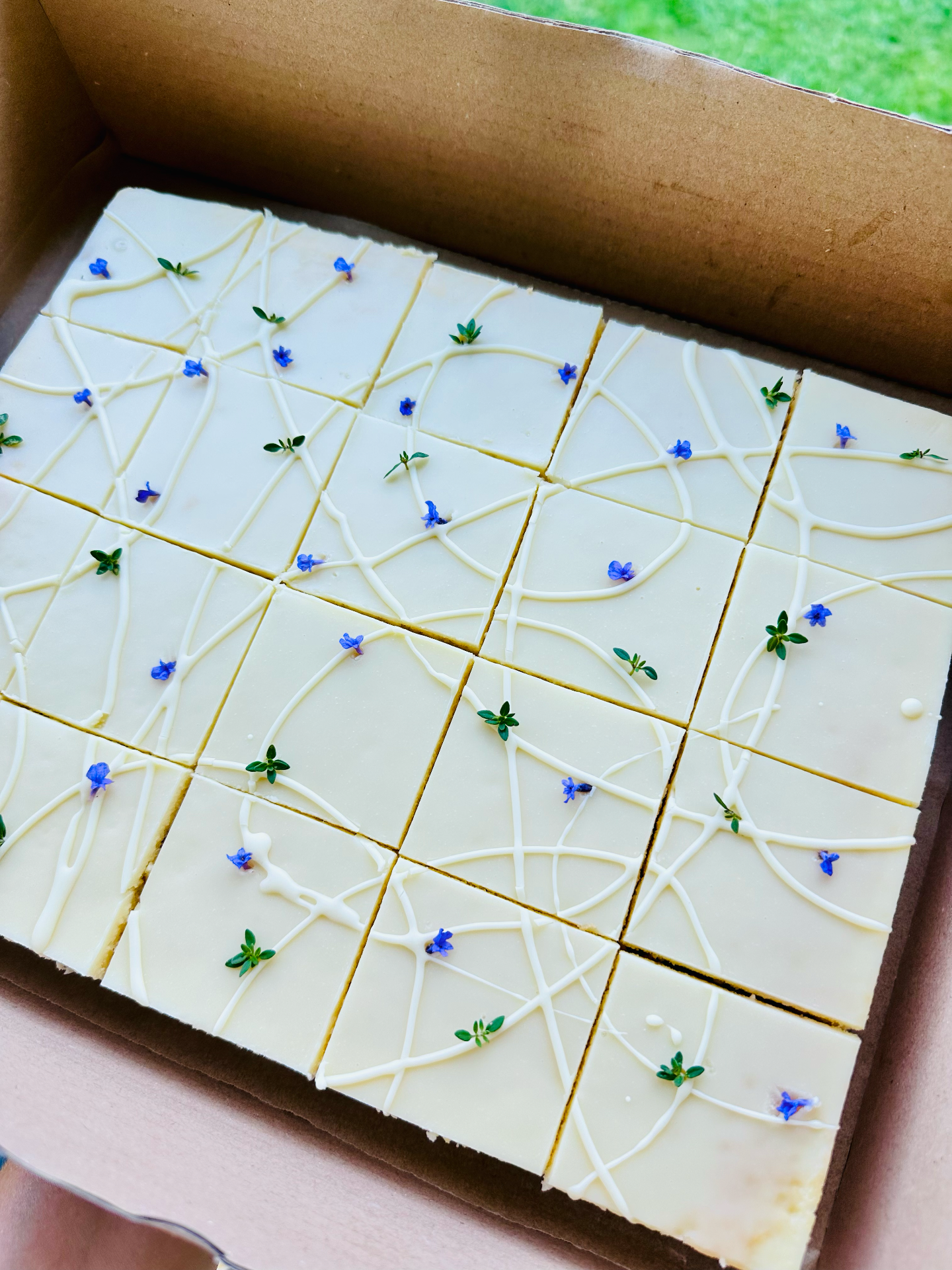 zdobený yuzu ganache a jemnými jedlými kvítky